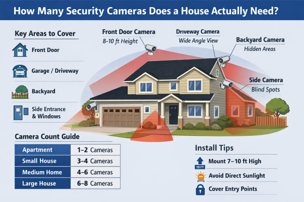 If you cover those routes correctly, 3–6 cameras usually protect a house better than 10 poorly placed ones.
